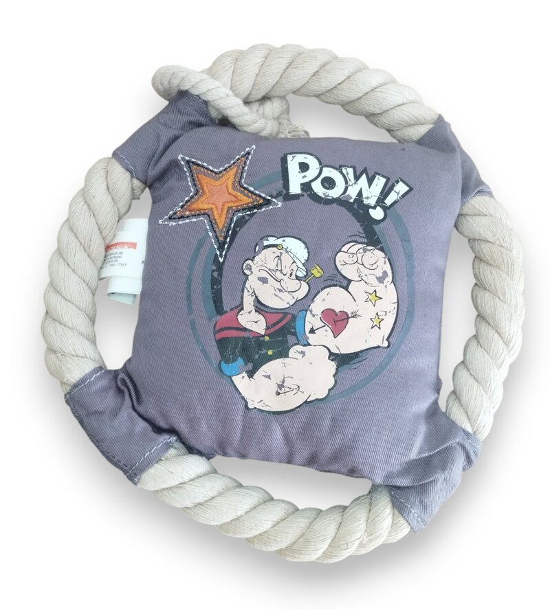 Realizzato con corda intrecciata resistente e centro in tessuto imbottito con la simpatica stampa di Braccio di Ferro, è perfetto per: